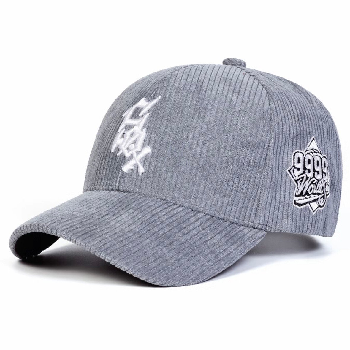 Gorra de terciopelo gris con bordado blanco. Streetwear moderno y versátil.